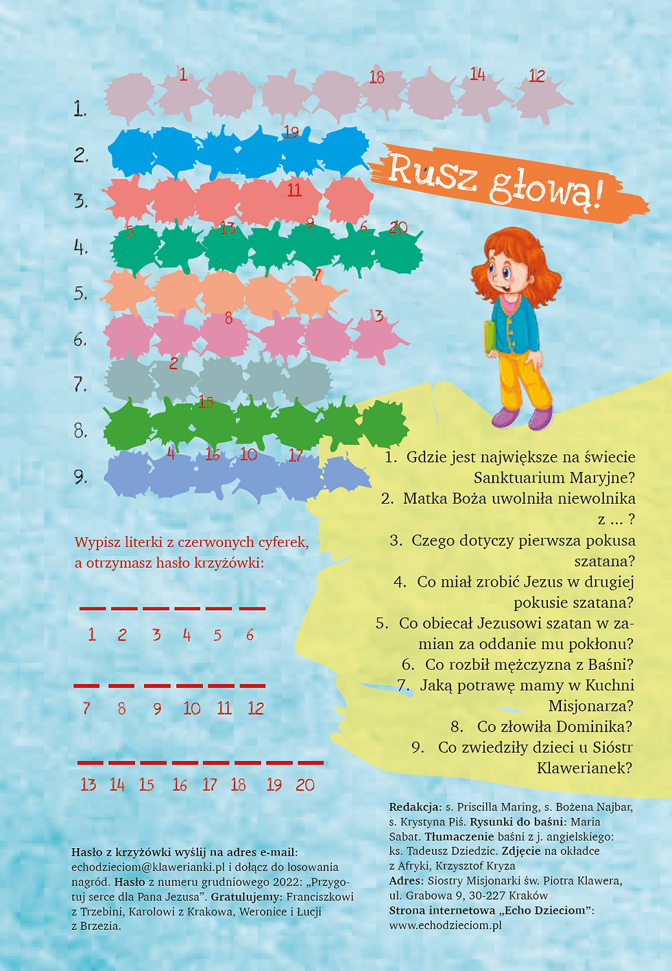 Echo dzieciom luty 202311 lut 20231 minut(y) czytania~ Matka Boża z Aparesidy~ Pokusy~ Mężczyzna i jego żona~ Z kuchni Misjonarza~ Pirania i palec~ Wycieczka do sióstr klawerianek była o wiele lepsza od kina~ Rusz głową i rozwiąż krzyżówkę